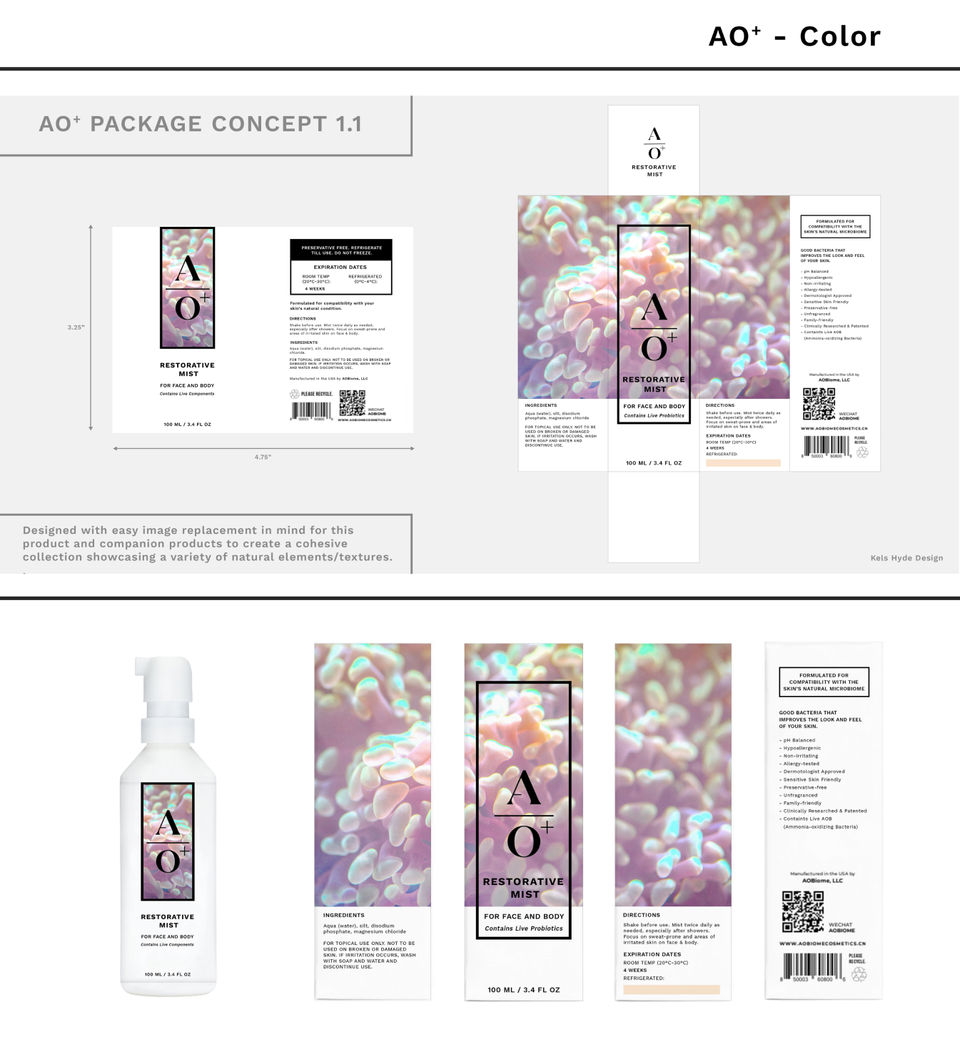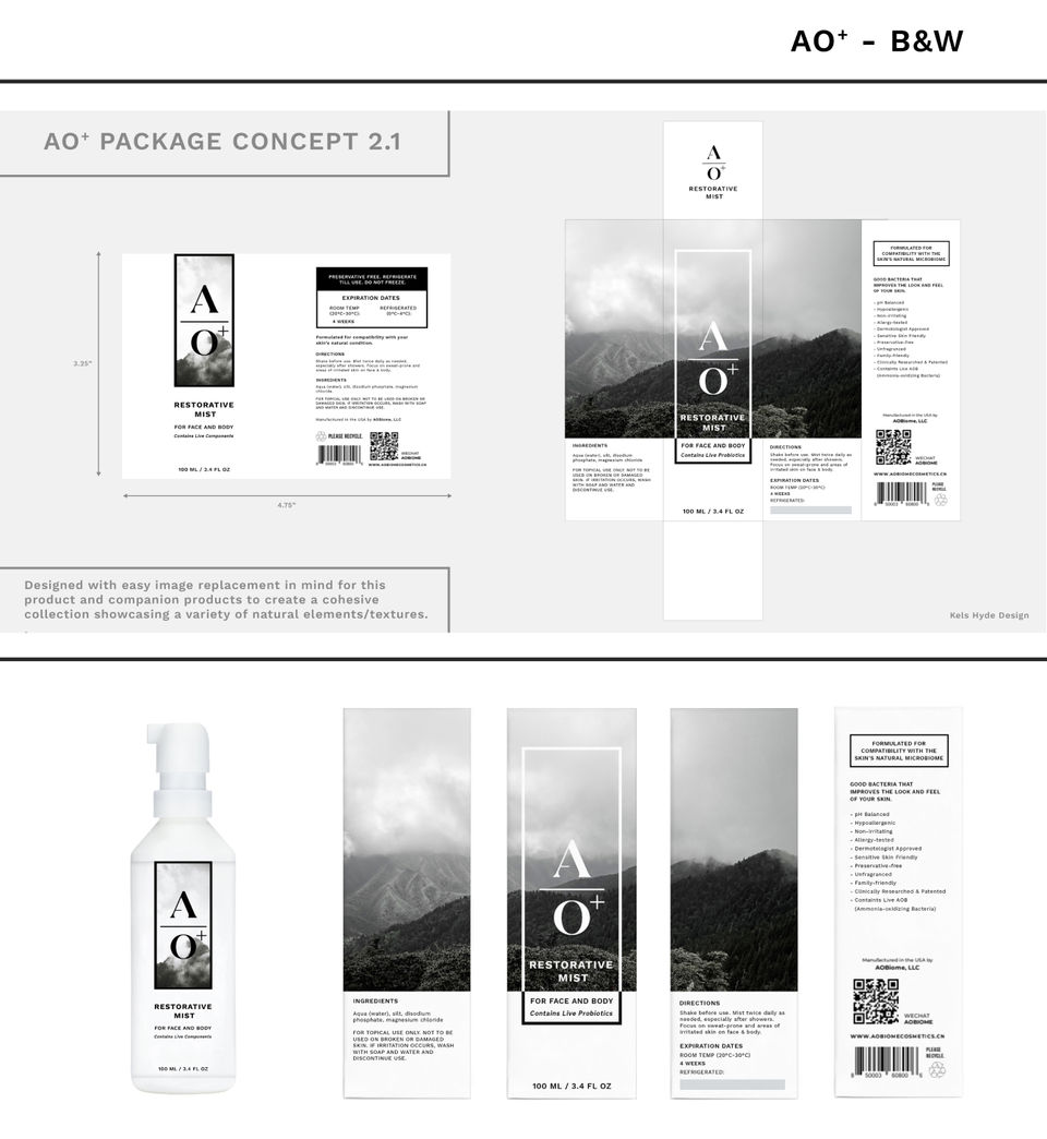 AOBiome Therapeutics pioneered the use of ammonia-oxidizing bacteria as a microbiome balancing, probiotic mist with topical anti-inflammatory and pH-lowering properties. I began working with AOBiome in its infancy as a design consultant and product photographer, before being contracted to develop packaging for some of their subsidiary brands.