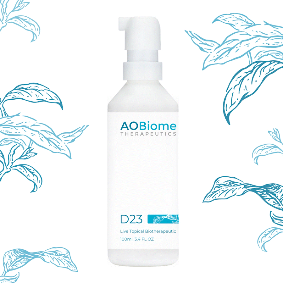 2021 - Bottle label design for AOBiome’s D23 sample strain mist that incorporates their logo in a clean and unisex design